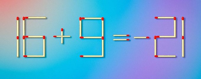 Pe imagine – o egalitate incorectă formată din 26 de chibrituri: 16 + 9 = -21. Sarcina ta este să tragi doar unul dintre ele pentru a face egalitatea corectă.