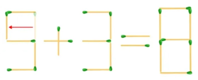 Secretul constă în schimbarea formei numerelor: trebuie doar să mutați un chibrit astfel încât unul dintre „trei” să se transforme în „cinci”. După aceea, exemplul devine absolut corect – 5+3=8.