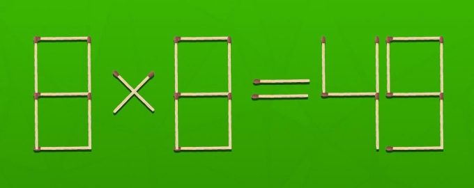 Mai jos veți vedea o imagine, pe care sunt așezate chibrituri cu egalitatea 8×8=49. Evident, aici există o greșeală, deoarece produsul acestor numere ar trebui să fie egal cu 64.