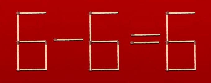 Acest test rapid de IQ vă propune să corectați o egalitate matematică incorectă prin efectea unei singure mișcări. Exemplul din fața dvs. este 6 – 6 = 6, format din 21 de chibrituri, ceea ce încă nu are sens logic. Sarcina este să trageți un singur chibrit și să transformați egalitatea într-una corectă.