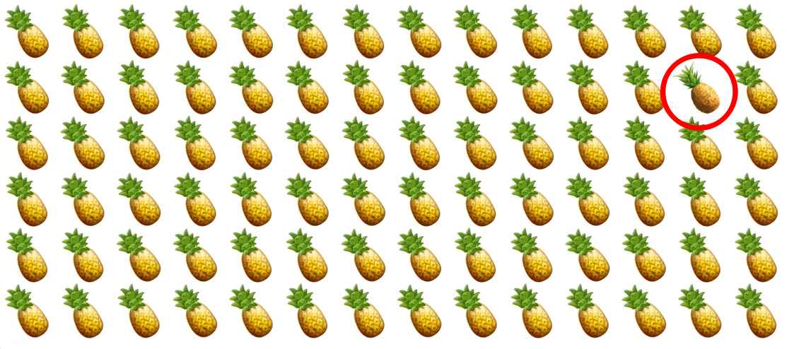 În imagine există mai mulți ananasuri, ei sunt prezentați în mai multe rânduri. Sarcina ta este să găsești un ananas special care este diferit de toate celelalte.