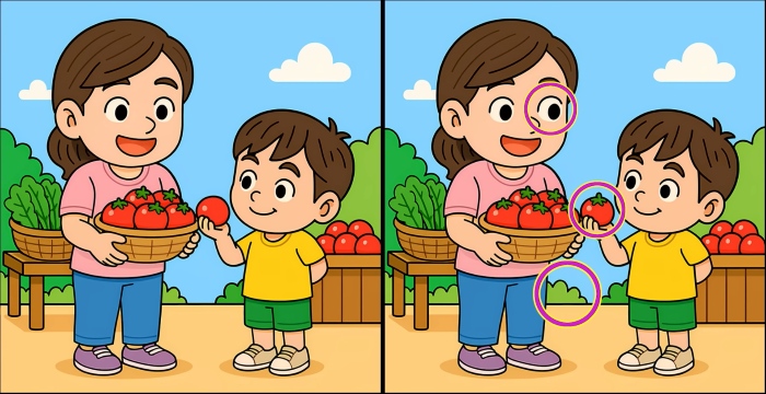 Așadar, ești pregătit pentru următoarea provocare? Uită-te atent la cele două imagini cu o mamă și un fiu care culeg roșii. La prima vedere pot părea la fel, dar există 3 mici diferențe. Crezi că le poți găsi pe toate în 45 de secunde? Încearcă și testează-ți acuitatea viză!