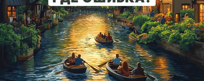 În fața ta se află o imagine care prezintă un peisaj frumos al unui oraș de seară. Între case curge un râu, pe care plutesc oameni în bărci. La prima vedere, imaginea pare normală, dar, de fapt, ea conține o eroare grosolană.